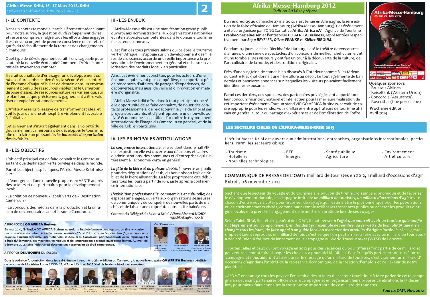 L’association Afrika-Messe-Kribi s’appuie sur le réseau d’affaires Go Africa Businnes, et a pour objectifs à moyen terme de créer entre 3000 et 4500 emplois au Cameroun rural d’ici 2015, améliorer les conditions de vie des populations des villages, et agir sur l’utilisation des ressources naturelles – eau et énergie – d’ici 2022.